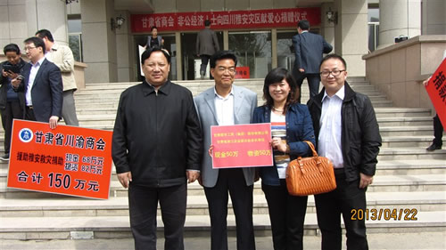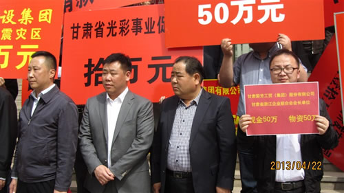 2013年4月22日下午15時(shí),在甘肅省政協(xié)一樓,由甘肅省委常委、省委統(tǒng)戰(zhàn)部部長澤巴足,省委統(tǒng)戰(zhàn)部副部長、甘肅省工商聯(lián)黨組書記、第一副主席吳繼德等相關(guān)領(lǐng)導(dǎo)出席了“甘肅省商會(huì)非公經(jīng)濟(jì)人士向四川雅安災(zāi)區(qū)獻(xiàn)愛心捐贈(zèng)儀式”。捐贈(zèng)現(xiàn)場(chǎng)眾多甘肅省非公企業(yè)向4月20日雅安市地震災(zāi)區(qū)進(jìn)行了捐贈(zèng),廣大愛心企業(yè)和人士用自己的實(shí)際行動(dòng)對(duì)災(zāi)區(qū)同胞奉獻(xiàn)了自己的真情和祝福。