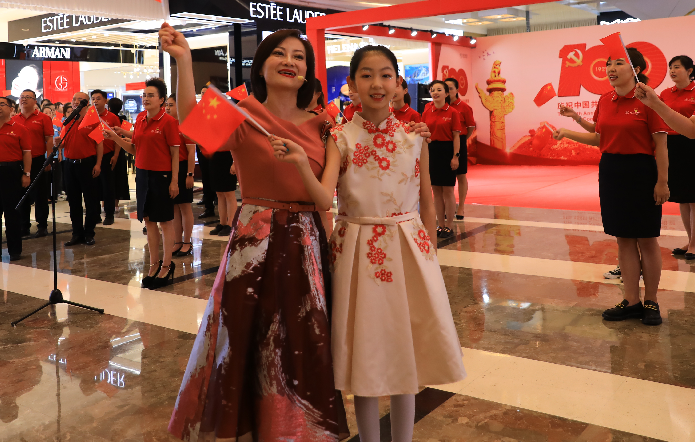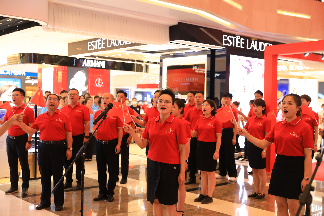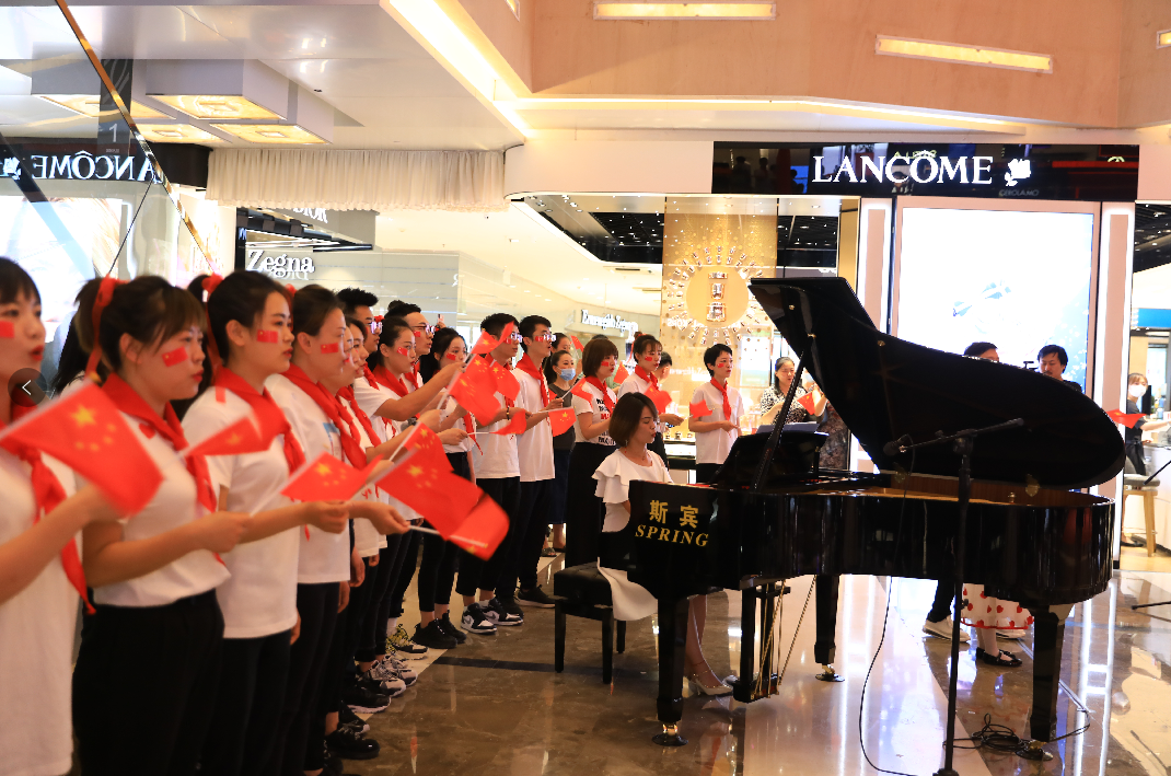 國芳百貨中廳,隨著鋼琴聲響起,活動在男、女領(lǐng)唱“歌唱我們親愛的祖國,從此走上繁榮富強(qiáng)”的歌聲中拉開了活動的序幕,30余名國芳集團(tuán)黨員及員工代表緩緩向主舞臺走來,大家手持國旗,組合成“100”字樣,神采奕奕,高聲齊唱。與此同時,現(xiàn)場的圍觀顧客也紛紛加入到隊伍當(dāng)中,為演出錦上添花。