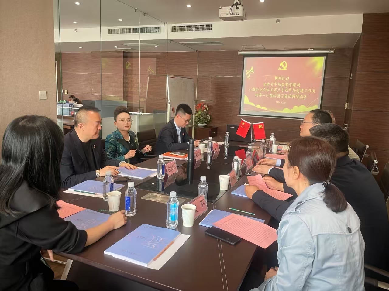 2024年4月26日,甘肅省市場監(jiān)督管理局小微企業(yè)個體工商戶專業(yè)市場黨建工作處侯巍處長與省、市、區(qū)、街道四級市場監(jiān)管局非公有制經(jīng)濟(jì)黨建處室相關(guān)負(fù)責(zé)人一行蒞臨國芳集團(tuán)黨委進(jìn)行調(diào)研指導(dǎo)并座談交流。