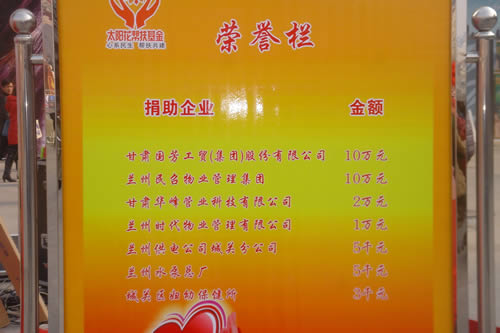 2012元月6日下午3時,甘肅國芳集團(tuán)聯(lián)合城關(guān)區(qū)皋蘭路街道黨工委、辦事處舉行了“創(chuàng)先爭優(yōu)、扶貧濟(jì)困”太陽花幫扶基金啟動儀式,充分體現(xiàn)民生為本的服務(wù)宗旨,著力搭建社會幫扶救助平臺,切實解決弱勢群體實際困難,促進(jìn)和諧街道建設(shè)。