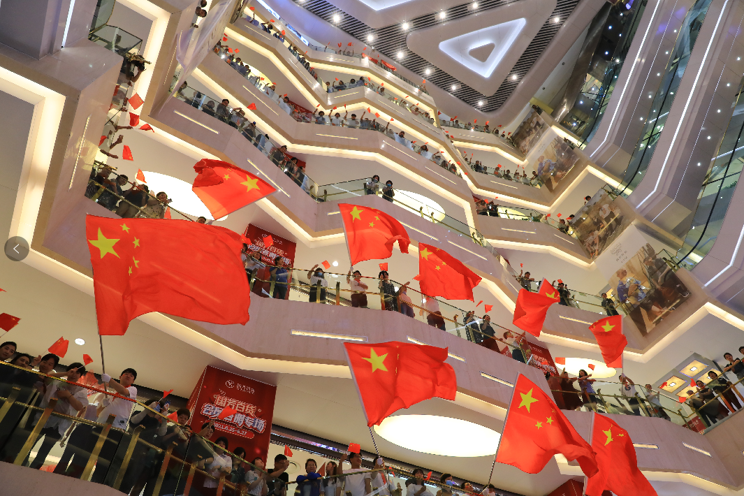 國芳百貨中廳,隨著鋼琴聲響起,活動在男、女領(lǐng)唱“歌唱我們親愛的祖國,從此走上繁榮富強(qiáng)”的歌聲中拉開了活動的序幕,30余名國芳集團(tuán)黨員及員工代表緩緩向主舞臺走來,大家手持國旗,組合成“100”字樣,神采奕奕,高聲齊唱。與此同時,現(xiàn)場的圍觀顧客也紛紛加入到隊伍當(dāng)中,為演出錦上添花。
